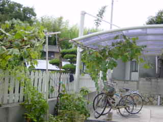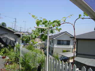 2002年,日よけを兼ねてユニットパイプで棚を作った。棚を作ったのでかなり成らせることできるが,まだ木も若いので50房ぐらいにした。開花前に花穂(かすい)を整形しなかったので花振るいをしてしまい,実がまばらとなってしまった。ま,売るのでもなく食べられたらいいと思い,かっこいい房は来年のお楽しみとする。