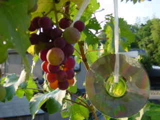 房に袋をかけても小鳥がつつくので,CD−ROMの盤をぶら下げてみた。虹色に光る面が反射して鳥よけの役目をはたしてくれたようである。