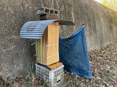 そこで巣箱の防寒のため、古い茣蓙を巻いてやりました。巣箱の重さも軽かったので越冬が心配です
