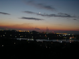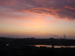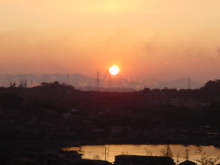 東の空が白みかけた。まだ上弦の月がのこっている。7時17分,水島の工場の煙突の間から初日が顔を出し始めた。
