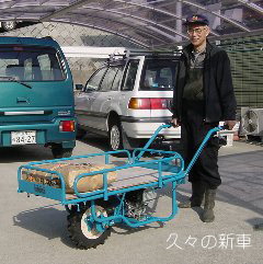 さっそくエンジンをかけてみる。小型ながらも4サイクルで2馬力ある。色はブルー。最大積載容量120キログラム。