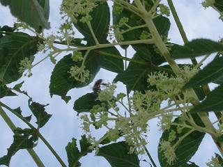 U野さんの畑をのぞいていたら,タラの木に花が咲いていた。その花にミツバチがさかんに訪れていた。蜜があるのだろう。わが家のミツバチに違いない。