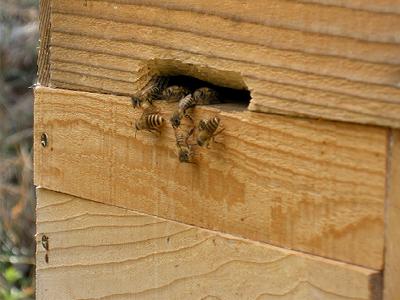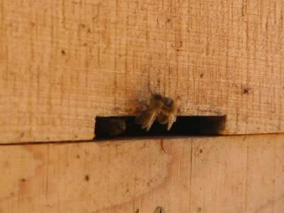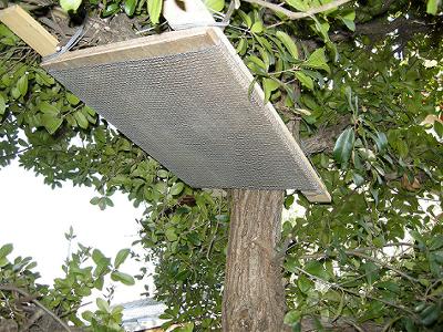 暖かくなるとミツバチの動きも活発になる。足に花粉団子を付けて帰ってくるハチが多い。花粉は蜂の子の大切な食べ物なので,女王蜂の産卵が順調のようである。そうなると分封も始まる。巣別れの時がくる。巣別れしたハチの群れは一時大きなかたまり(蜂球)となって近くの木にぶら下がる。そのぶら下がりに適した場所を提供すべく誘導物を考えてみた。木の板に金網を張ったものをカイヅカイブキやウバメカシ(バベ)の枝の下に設置してみた。うまくそのときにぶら下がってくれるといいのだが。