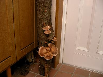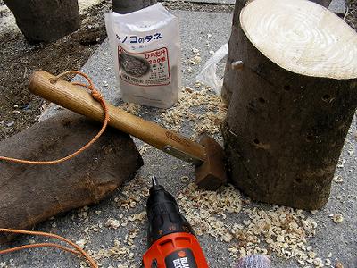 先日伐採したエノキの幹が結構太いので,ヒラタケを植えてみることにした。ホームセンターに棒駒菌(くさび式)があり,これを買ってきた。椎茸の稙菌と同じようにドリルで穴をあけ,駒を打ち込む(なぜかハンマーはカシン(イタリー製)のロックハンマー)。ほだ木は玉切りにしたものを使う。稙菌したほだ木はワラで囲い,湿り気を与える「仮伏せ」をする。「本伏せ」は土中に9分目ほど埋めるという。ヒラタケは焼いて二杯酢で食べるとおいしい。