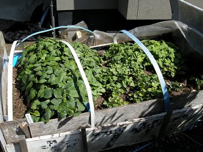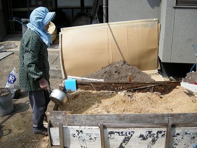 師匠(母)の懸案だった芋床の準備をした。さつま芋を芽吹かせ,イモヅルを作るための温床。古い土を一旦取り出し,底へ発酵材である糠や枯れ葉を入れる。水をかけ踏み込んで,その上に土を戻す。1週間ぐらいで発酵熱が上がってくるという。昔,葉たばこを作っているとき,たばこの苗を作るのにこの方法を用いていた。現在では電熱で行うのだろう。