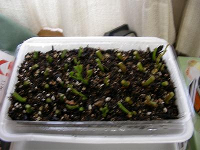 秋に摘んで越冬させたイモヅルをひと芽ずつ切って,パックに挿した。芽と根が出ればイモヅルの役目をしてくれるという。うまくいけばイモの苗がたくさんできる。(^_^)