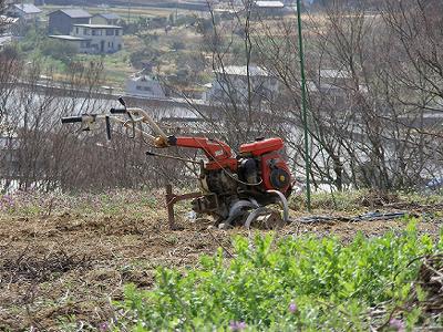 小屋の中から管理機を引っ張り出しエンジンを始動。快調。30年使っている。ローター(刃)は交換しているのでよく土を掘り返す。(動画→ nekomanga)