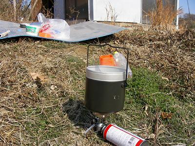 昼は持ってきたガスコンロを使ってカップ麺。小屋の前に敷いたシートの上で食べる。メジロの鳴く梅の木のそばでソバ。うまかった。