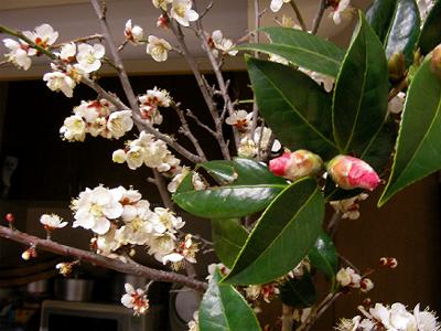 剪定した小梅の枝を部屋に置いたらいっせいに咲いた。ワビスケも咲きそう。