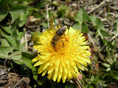 タンポポの花にとまり,花粉まみれになりながら蜜を集める。