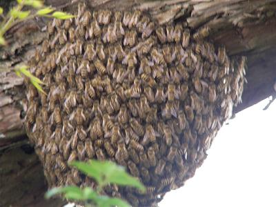 W氏からの分封群を新しい巣箱に設置し終えて一段落していたら,今度は我が家の蜂群が騒がしくなった。巣箱とハナズオウの周りをブンブンと音を立て,霞がかかったように飛び交う。これが分封の始まりだと思った。見ていると,カイヅカイブキの枝の二股になった部分に小さなこぶができはじめ,それがだんだんと大きくなった。蜂球である。このときのために買っていた馬の毛の刷毛を持って回収に向かった。巣箱に刷毛で蜂球を掻き落としたがうまく入らない。ならば巣箱を逆さにして二股になった枝にかぶせると,残った蜂群がぞろぞろと箱の中に入っていき,巣箱にうまい具合収まった(動画)。分封の様子をこの目で見たのは初めてである。