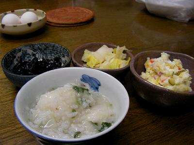 元旦から魚や餅を食べ続けたので,さぞや胃が弱っているだろうと,あっさりとした七草のお粥をいただくようだが,我が家では餅の入っているおじやとなる。師匠は「ナズナしかなかった」と嘆いており,それでもセリは家のそばの溝にあり,ダイコンを加え何とか3種そろえたようである。お粥の中から出てくる餅もおいしい。慣れである。