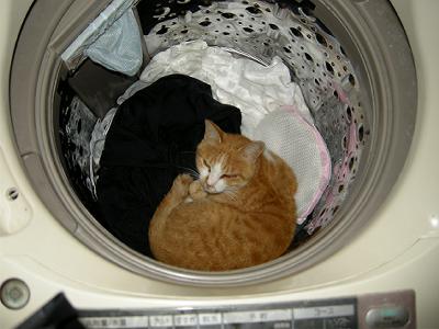 猫たち,いろんな居場所を求めて家の中をうろつく。洗濯機をのぞくと汚れ物の上に居たりする。