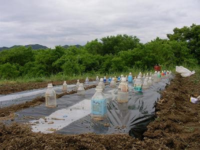 二日続きの初夏の晴天。昨日はピーナッツの続きを植え,サツマイモ用のマルチを張った。ほんとうは雨の翌日に,湿り気を包み込むように張るのがいいらしい。カラスがペットボトルのかぶせを倒し,植えた豆を食べられた所があった。植え足して,ペットボトルのかぶせが60本。