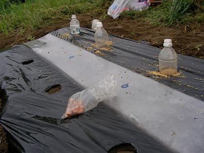 ピーナツをやっと蒔いた。育苗中はマルチングすることに。一粒ずつ蒔き,ペットボトルをかぶせた。カラスがつつくのでそれを防ぐことが出来る。今夜は寒くなり,遅霜があるともいうので防寒にもなるだろう。