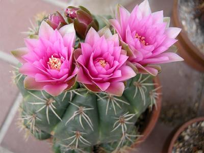 サボテンの花と変種のアジサイが咲いている。