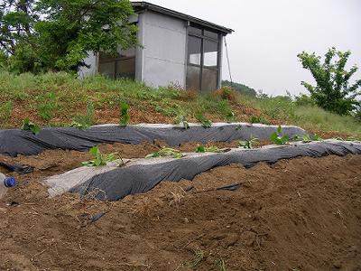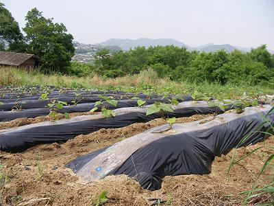 サツマイモの続きを植えた。金曜日から土曜日にかけて雨が降ったものの,今朝から陽ざしが強くなった。黒マルチにいきなり苗を挿すのはまずいと思ったが案の定,苗はたちまち暑さに負けて萎れてしまった。マルチの上に雑草かワラを置くべきだった。体力の限界を感じたので,もしだめだったら後日ワラを持ってきてから挿し直すことにする。