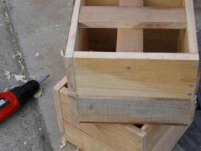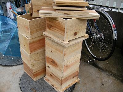 カーポートの下で蜂の巣箱を作った。材料をホームセンターで買い,その場で所定の寸法にカットしてもらった。切り口がカンナをかけたようにすべすべで直角だから,ぴったりと組み上がる。たちまち14個出来た。いいサービスがあるもんだ。