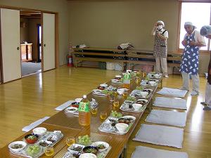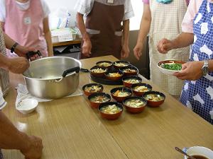 ほとんどが委員さんによって食材などが準備されており,生徒は慣れない手つきで野菜などを刻むだけ。わいわいとやれ切り方がウスイとかアツイとか口ばかりで手があまり動いていない。委員さんのサポートを受けながら,それでも4種類のメニューとなった。「ささみと豆腐のホイル焼き」「こんにゃくとゴボウのピリ辛煮」「けんちん汁」「ぽりぽりめかぶ」どれもヘルシーなものばかり。出汁も鰹と昆布から本格的に作る。委員さんのサポートよろしく午前11時半には全品できあがり,大広間で早速の試食会となった。どれも薄味で上品な味付けである。こういうのを日常的に食生活に採り入れるといいのだろうなあ。一人で作れるようになれという教えでもある。自分たちで作ったということもあり楽しい食事会でもあった。