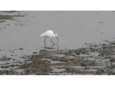 干拓地を囲む堤防の外は干潟で,白鷺が足を使って巧みに獲物を探していた。