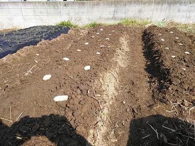 こちらは,例年もみ殻をかぶせて植えている。まだ寒さもきついのでこの方法で植えてみる。スリット植えはもう少し暖かくなってやることにする。