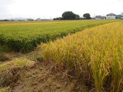 秋祭りが終わり,水田の水も落とし,刈り入れの時となるが,わが田んぼの稲はまだまだ青い。刈り取りは11月のはじめになりそう。隣の田はコンバインを入れ,刈り取りが始まっている。