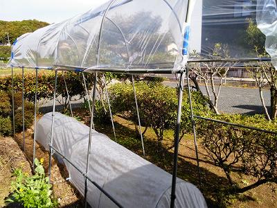 今日もぽかぽか陽気だったので,昨日ビニールをかぶせたトンネルに水をやった。トンネルの中は暖かく,うまく芽が出てきそうだ。