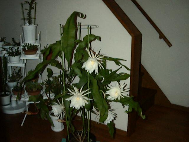 月下美人はクジャクサボテンの原種といわれています。名前のとおり夕方から夜にかけて花が開き,朝までにはしぼみます。6月から9月頃まで2回ほど咲きます。小さいつぼみが昆布かワカメのような葉から出てだんだんと大きくなり,それがいよいよ咲きそうになるとみんなに見てもらいたくなります。この夜,月が出るとまさに月下の美人となりますが,なかなかうまくはいかないようです。咲いた夜は甘い花の香りが立ちこめ,寝ころんでながめたり,写真をいろんな角度から撮ったりします。