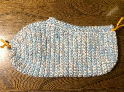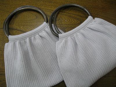 夏糸で編んでいます。長方形に編んで絞って持ち手を付けました。